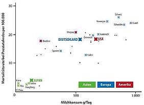 Austria, Sweden and Norway were for centuries the countries with an outstanding consumption of sugar, meat and milk. In 2000, there were 27 deaths for every 100,000 men across a range of ages. The cause of death in such cases was prostate cancer and it is 27 times higher than in China (1 for every 100,000), 10 times higher than in Thailand (2,65 for every 100,100) and still 5 times higher than in Japan (5,47 for every 100,000).