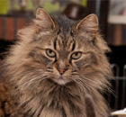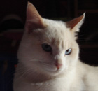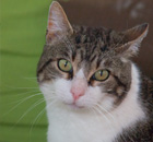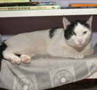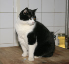 Männlich, ca. 6 Jahre alt. Von Geburt an leidet er unter Koordinationsstörungen, die durch eine Fehlentwicklung des Kleinhirns ausgelöst werden. Das hält ihn aber nicht davon ab, ein sehr glücklicher, forscher, verspielter und aktiver Kater zu sein.