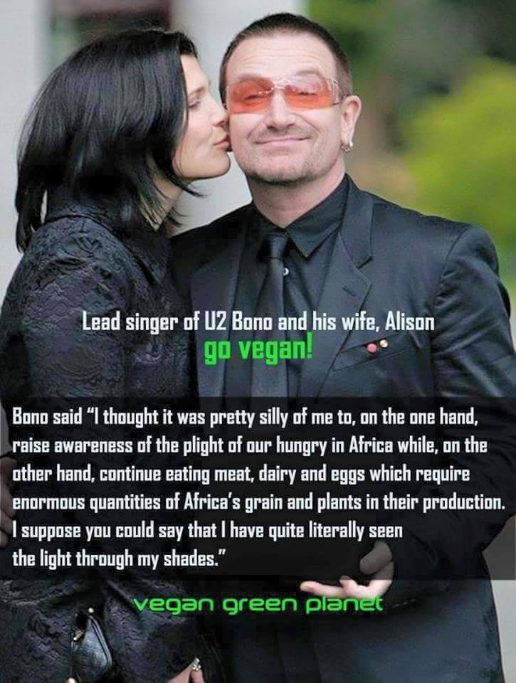 Bono sagte dazu: „Ich dachte, dass es ziemlich dumm von mir ist, auf der einen Seite Bewusstsein für die Notlage der Hungrigen in Afrika zu schaffen, aber auf der anderen Seite damit fortzufahren, weiterhin Fleisch, Milchprodukte und Eier zu essen, für deren Erzeugung enorme Mengen Getreide und anderer Nahrungspflanzen gebraucht werden. Ich kann durchaus sagen, dass ich buchstäblich das Licht durch meinen Schatten gesehen habe.“