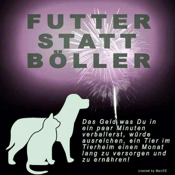 Nachdem man das „Fest der Liebe und des Friedens“ mit einer Qualorgie und einem Vernichtungsfeldzug gegen die Tiere, die Umwelt und die Hungernden begangen hat, reicht es immer noch nicht. Man möchte sich weiter auf Kosten der Schwachen und Schwächsten amüsieren, obwohl die Knallerei zu Silvester ein Verbrechen gegenüber den Wildtieren, Haustieren, kranken und gerade sterbenden Menschen ist. Die Knallerei ist ein völlig hirnloser Schwachsinn, der nicht nur immenses Leid bei Tieren verursacht, sondern auch erhebliche Giftmengen in der Umwelt freisetzt.