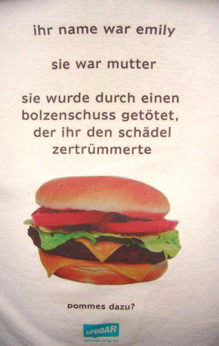 Was das Poster verschweigt: Emily wurde zwar der Schädel zertrümmert, nur betäubte es sie nicht und sie wurde daher bei vollem Bewusstsein zerschnitten. Untersuchungen in deutschen Schlachthöfen zeigen, dass jährlich über 200.000 Rinder und 500.000 Schweine alleine in Deutschland dieses grauenvolle Schicksal bei vollem Bewusstsein erleiden! Aber von Tierausbeutern, Politikern, Behörden und Konsumenten werden die Grausamkeiten an den Tieren billigend in Kauf genommen. Denn es geht ja um einen ungesunden Gaumenkitzel, der offensichtlich wichtiger ist als das Leid der Tiere, das Leid der verhungernden Kinder und als die eigene Gesundheit. TV-Sender berichteten mehrfach darüber. Zum Beispiel die Tagesthemen http://www.tagesschau.de/multimedia/video/video678292.html (ab Minute 21) Keiner kann mehr sagen, er habe es nicht gewusst. Jeder Fleischesser und Milchtrinker finanziert die Grausamkeiten daher bewusst und in voller Kenntnis der Folgen des Konsums.