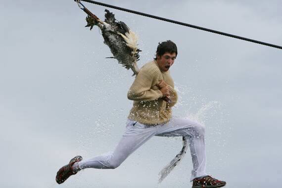 Es ist ein Fest, bei dem sich Männer so lange wie möglich an einer Gans festhalten müssen, die an den Füßen gebunden an einem Seil hängt. Das Seil ist von einem Hafen zum anderen gespannt.