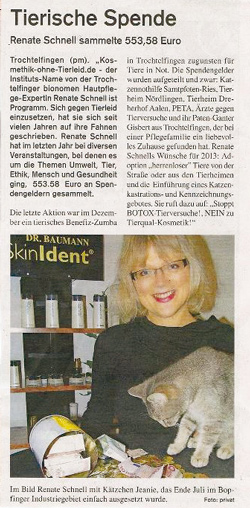 Kosmethik-ohne-Tierleid.de. Der Instituts-Name von der Trochtelfinger bionomen Hautpflege-Expertin Renate Schnell ist Programm. Sich gegen Tierleid einzusetzen hat sie sich seit vielen Jahren auf ihre Fahnen geschrieben. Renate Schnell hat im letzten Jahr bei diversen Veranstaltungen bei denen es um die Themen: Umwelt – Tier – Ethik – Mensch & Gesundheit ging, über 553.58 € an Spendengeldern gesammelt. Ganz herzlichen Dank an dieser Stelle und auch an Ihre Kundinnen, die sie dabei unterstützt haben. Die letzte Aktion war im Dezember ein tierisches Benefiz-Zumba in Trochtelfingen zugunsten für Tiere in Not. Die Spendengelder wurden aufgeteilt und zwar: Katzennothilfe Samtpfoten-Ries, Tierheim Nördlingen, Tierheim Dreherhof Aalen, PETA, Ärzte gegen Tierversuche und ihr Paten-Ganter Gisbert aus Trochtelfingen, der bei einer Pflegefamilie ein liebevolles Zuhause gefunden hat. Renate Schnell´s Wünsche für 2013: Adoption „herrenloser” Tiere von der Strasse, oder aus den Tierheimen. Einführung eines Katzenkastrations- und Kennzeichnungsgebotes. Stoppt BOTOX-Tierversuche. NEIN zu Tierqual-Kosmetik! Im Bild Renate Schnell mit Kätzchen Jeanie, diese wurde Ende Juli im Bopfinger Industriegebiet einfach ausgesetzt.