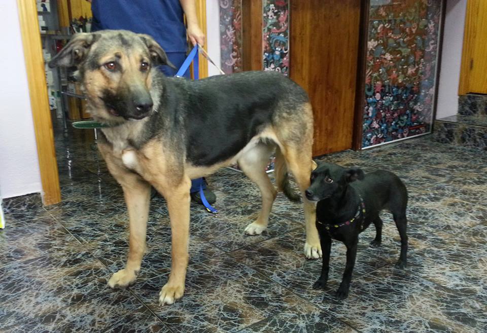 Gerettet von El Hogar ProVegan. Das Bild zeigt die beiden beim Tierarzt. Beide sind unzertrennlich.