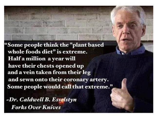 „Einige Leute denken, dass eine rein pflanzliche Ernährung extrem sei. 500.000 Menschen werden jährlich der Brustkorb aufgeschnitten, eine Vene aus dem Bein herausgeschnitten und an die Koronararterie des Herzens genäht. Einige Leute würden das extrem nennen.“