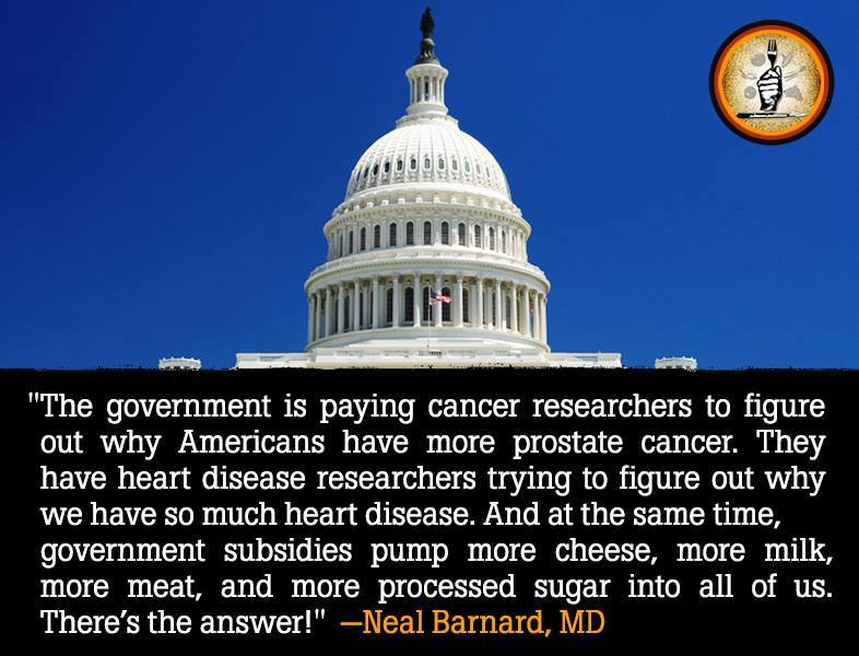 „Die Regierung bezahlt Krebsforscher um herauszufinden, warum immer mehr Menschen an Prostatakrebs leiden. Sie haben Wissenschaftler für Herzerkrankungen, die versuchen herauszufinden, warum so viele Menschen an Herzerkrankungen leiden. Gleichzeitig subventioniert die Regierung alle Massnahmen, mehr Käse, mehr Milch, mehr Fleisch und mehr raffinierten Zucker in uns hinein zu pumpen. Das ist die Antwort!“
