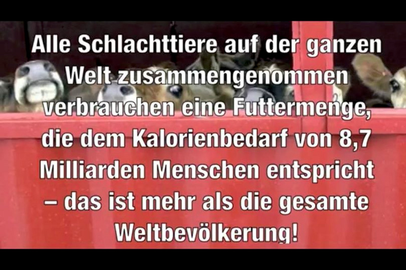 Nahrungsmittel, die für die Fütterung von gequälten Tieren in der Tierindustrie verwendet werden, stehen logischerweise nicht mehr für die Ernährung von Menschen zur Verfügung.