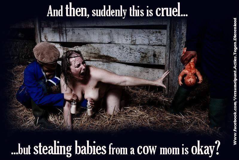 ....aber eine Kuh zu versklaven, zu vergewaltigen, ihre Milch zu stehlen, das Kind wegzunehmen und zu ermorden ist okay?