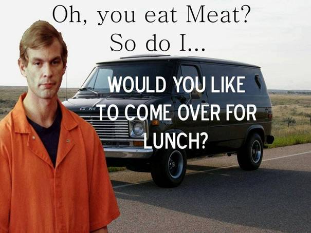 Der Herr auf dem Bild, Jeffrey Dahmer, ass auch gerne Fleisch. Während er vom Staat dafür mit lebenslanger Haft bestraft wurde, werden Sie dafür vom Staat belohnt. Denn der Staat subventioniert nicht nur die Fleischproduktion, so dass Fleisch unverschämt billig ist, sondern lässt auch die gesamten Umweltschäden durch Fleisch und andere Tierprodukte einfach unbezahlt, bis dann die grosse Bombe eines Tages platzt. Dazu einige Stichworte: Bakterienresistenzen, Nitrat im Grundwasser, Wasserverbrauch, Rodung Regenwald, Klimakatastrophe, Überfischung der Ozeane, Vernichtung der Lebensgrundlagen nachfolgender Generationen usw.