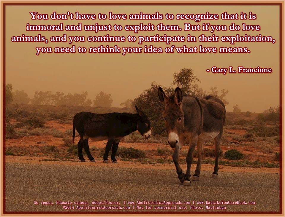 „Man braucht Tiere nicht zu lieben, um zu erkennen, dass es unmoralisch und ungerecht ist, sie auszubeuten. Wenn Du aber Tiere liebst und fährst damit fort, Dich an ihrer Ausbeutung (durch das Essen von Tierqualprodukten) zu beteiligen, dann solltest Du noch einmal überdenken, was Du unter Liebe verstehst.“