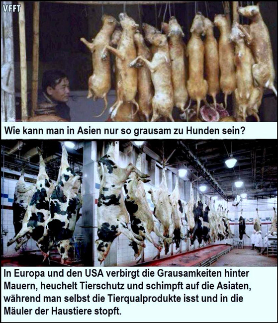 Moralische Schizophrenie – das Hundefleisch auf dem Teller der Asiaten kritisiert man, während man das Qualfleisch auf dem eigenen Teller und in den Napf des Haustieres legt