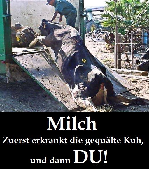 Auf dem Foto sehen eine der vielen sogenannten „Downer-Kühe“, die vom Milchentzug völlig ausgelaugt sind und nicht mehr aufstehen können, weil sie zu schwach oder die Knochen gebrochen sind. Diese werden dann rücksichtslos entsorgt. Die Schmerzen der Tiere und ob weitere Knochen bei der Entsorgung brechen interessieren dann offensichtlich nicht. Das geschieht geschützt vor den Augen der Öffentlichkeit im Verborgenen, aber es existieren unzählige Foto- und Filmdokumente davon. Jeder, der es wissen will, weiss mittlerweile auch, was er mit dem Konsum von Milch und Milchprodukten anrichtet.