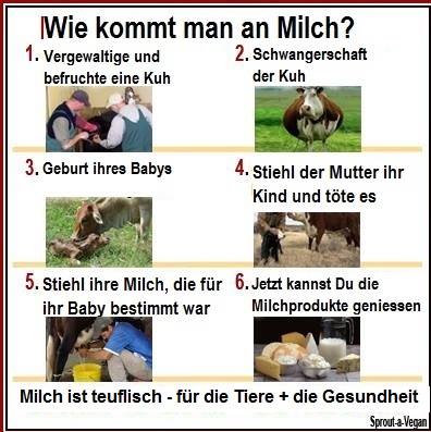 Die „Milchkühe“ sind in kurzer Zeit durch die ständige Milchproduktion verbraucht und werden geschlachtet, wenn aus den ausgelaugten Tieren nicht mehr genug Milch herauszuholen ist. Statt einer normalen Lebensspanne von etwa 25 – 30 Jahren werden die ausgelaugten „Milchkühe“ schon nach 4 – 5 Jahren „entsorgt“. Jährlich werden die Kühe zwangsgeschwängert = vergewaltigt, damit der Milchfluss nicht versiegt. Denn nur nach der Geburt eines Kälbchens gibt eine Kuh Milch. Nach der Geburt werden Mutter und Kind getrennt, was einen traumatischen Trennungsschmerz bei beiden auslöst. Dieser Trennungsschmerz ist aufgrund der angeborenen Instinkte so dramatisch, dass sowohl die Kuh als auch ihr Kälbchen noch tagelang wegen der seelischen Schmerzen wimmern und teilweise laut schreien. Aber auch für die Kälbchen ist der Leidensweg noch nicht zu Ende. Die weiblichen Kälbchen kommen in die Milchproduktion, wo sie ihre ausgelaugten Mütter ersetzen. Auch diese Kälbchen sind dann im Teufelskreis von erzwungener Schwangerschaft, körperlicher Auszehrung durch intensiven Milchentzug, Geburt und traumatischem Trennungsschmerz für die Zeit ihres nur kurzen Lebens gefangen. Die männlichen Tiere werden in kleinen, dunklen Ställen für die Fleischproduktion gemästet, oftmals in Boxen, die kaum grösser als ihr Körper sind. Da aber weltweit viel zu viele Kälber produziert werden, vernichtet man diese einfach in sogenannten „Herodesschlachthöfen“. Diese Grausamkeiten geschehen nur deshalb, weil die Verbraucher nach Milch und Milchprodukte verlangen. Milch und Milchprodukte, deren verheerende Auswirkungen auf die menschliche Gesundheit inzwischen durch unzählige wissenschaftliche Studien aufgezeigt werden konnten.
