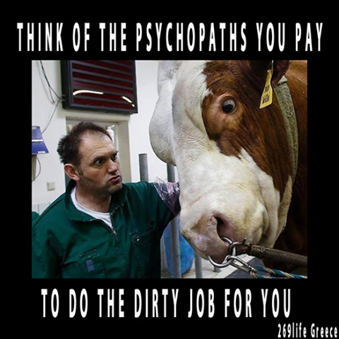 Die wahren Täter sind die Omnivoren, Vegetarier und diejenigen, die ihre Haustiere mit Fleisch füttern, also alle diejenigen, die für die schmutzige Arbeit zahlen und damit erst das Grauen für die Tiere verursachen!