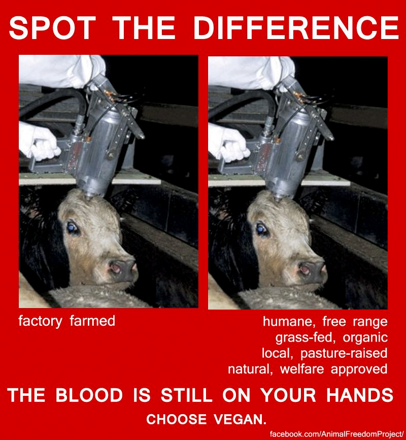 Das Gemeinsame: Das Blut tropft immer von Ihren Händen, gleichgültig welches Fleisch, welche Milch und welche Eier Sie kaufen und mit welchem Fleisch Sie Ihre Haustiere füttern.