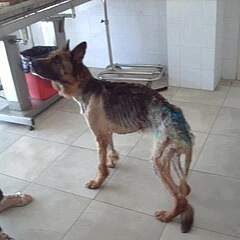 Das Bild zeigt die Schäferhündin Lara kurz nach ihrer Rettung aus einem Canili. Die beiden Videos zeigen die tolle Erholung von Lara: