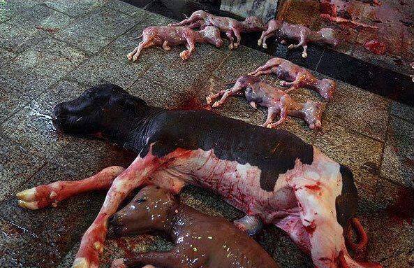 Jährlich werden die Kühe künstlich befruchtet, vergewaltigt und geschwängert, damit der Milchfluss nicht versiegt. Denn nur nach der Geburt eines Kälbchens gibt eine Kuh Milch. Nach der Geburt werden Mutter und Kind getrennt, was einen extrem traumatischen Trennungsschmerz bei beiden auslöst. Dieser Trennungsschmerz ist aufgrund der angeborenen Instinkte so dramatisch, dass sowohl die Kuh als auch ihr Kälbchen noch tagelang wimmern, muhen und schreien. Aber auch für die Kälbchen ist der Leidensweg noch nicht zu Ende. Die weiblichen Kälbchen kommen in die Milchproduktion, wo sie ihre ausgelaugten Mütter ersetzen. Auch diese Kälbchen sind dann im Teufelskreis von erzwungener Schwangerschaft, körperlicher Auszehrung durch intensiven Milchentzug, Geburt und traumatischem Trennungsschmerz für die Zeit ihres nur kurzen Lebens gefangen. Die männlichen Tiere werden in kleinen, dunklen Ställen für die Fleischproduktion gemästet, oftmals in Boxen, die kaum grösser als ihr Körper sind. Da aber weltweit durch die Milchproduk­tion viel zu viele Kälber „produziert“ werden, vernichtet man diese auch einfach in sogenannten „Herodesschlachthöfen“. Wenn Milchkühe unrentabel sind, kommen sie in den Schlachthof. Jährlich sterben Zehntausende ungeborene Kälbchen, weil trächtige Kühe geschlachtet werden. Die Bundestierärztekammer nimmt an, dass pro Jahr 180 000 trächtige Rinder geschlachtet werden. In diesem Stadium sind die Kälbchen in jedem Fall bereits schmerzempfindlich und leiden extrem, wenn sie im Leib der ermordeten Mutter qualvoll ersticken (siehe Foto mit den jüngsten Opfern des Vegetarismus). Diese Grausamkeiten geschehen nur deshalb, weil die Verbraucher nach Milch und Milchprodukten verlangen. Milch und Milchprodukte, deren verheerende Auswirkungen auf die menschliche Gesundheit inzwischen durch unzählige wissenschaftliche Studien aufgezeigt werden konnten.