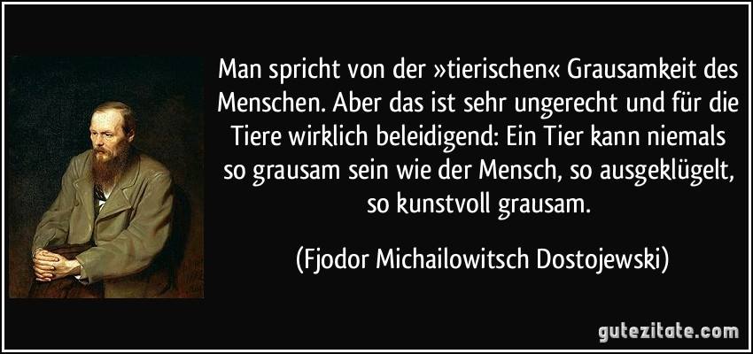„Man spricht von der „tierischen“ Grausamkeit des Menschen. Aber das ist sehr ungerecht und für die Tiere wirklich beleidigend: Ein Tier kann niemals so grausam sein wie der Mensch, so ausgeklügelt, so kunstvoll grausam.“