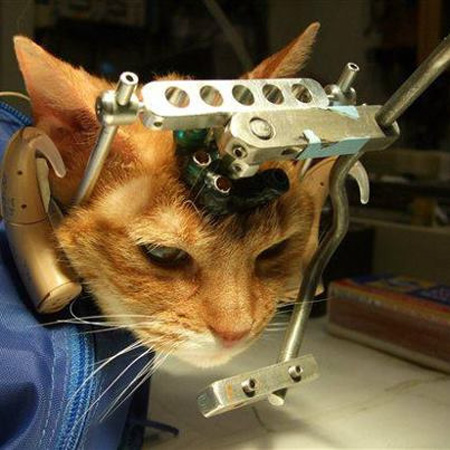 Zum Bild: Die Experimentatoren schrauben Stahlstifte in den Schädel der Katze, so dass sie sich nicht mehr bewegen kann. Dann implantieren sie ihr Elektrogeräte ins Ohr. Die massive Kopfwunde wird einer Infektion ausgesetzt. Die Experimentatoren hungern die Katze tagelang aus, damit sie anschliessend für einen Bissen Futter kooperiert. Anschliessend köpfen sie die Katze.