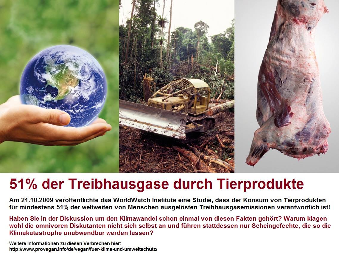 Am 21.10.2009 veröffentlichte das WorldWatch Institute eine Studie, dass der Konsum von Tierprodukten für mindestens 51% der weltweiten von Menschen ausgelösten Treibhausgasemissionen verantwortlich ist!