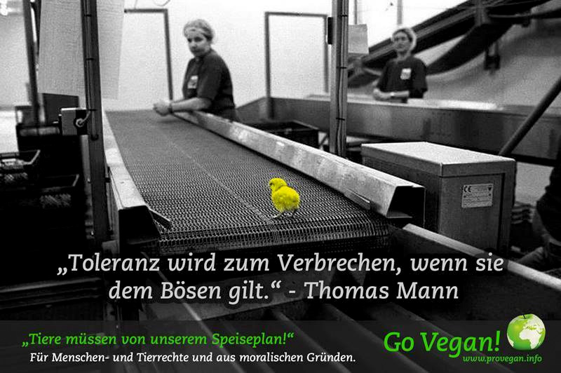 Viele Menschen scheinen über Toleranz und deren wahre Bedeutung gar nicht weiter nachzudenken. Ist Toleranz ein Wert an sich, der immer und überall zu gelten hat, gleichgültig um was es geht und welche Verbrechen begangen werden? Oftmals hört man die seltsamsten Argumente, wenn Toleranz gegenüber Fleisch-, Milch- und Eierkonsumenten eingefordert wird. Jeder habe ja schliesslich selbst einmal Fleisch gegessen und man sei nicht als Veganer zur Welt gekommen, vernimmt man dann erstaunt. Ein wahrhaft surreales Argument. Wenn es denn tatsächlich eine ernst zu nehmende Argumentation wäre, dürfte kein Mensch mehr auf Fehler anderer hinweisen, weil selbstverständlich jeder Mensch in seiner Vergangenheit schon einmal mehr oder weniger grosse Fehler gemacht hat.