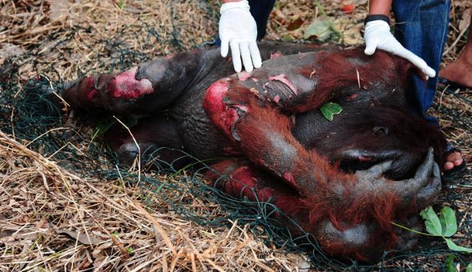 Das Bild zeigt ein Opfer der Palmölproduzenten und die Folgen des Konsums von Palmöl