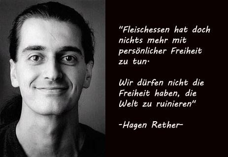 „Fleischessen, das Füttern von Fleisch an Haustiere und der Konsum von Milchprodukten, Eiern, Fisch hat doch nichts mehr mit persönlicher Freiheit zu tun. Wir dürfen nicht die Freiheit haben, die Welt zu ruinieren!“