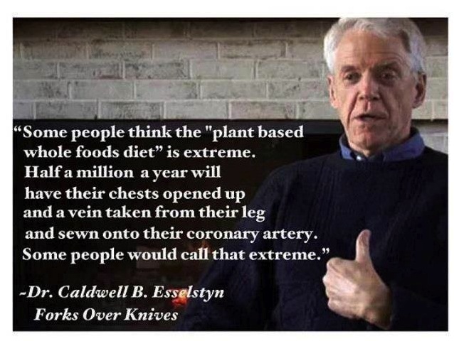 Dr. Caldwell B. Esselstyn: „Einige Leute denken, dass eine rein pflanzliche Ernährung extrem sei. 500.000 Menschen werden jährlich der Brustkorb aufgeschnitten, eine Vene aus dem Bein geschnitten und an die Koronararterie genäht. Einige Leute würden das extrem nennen.“ (Koronararterien sind die Blutgefässe, die das Herz mit Blut versorgen.)
