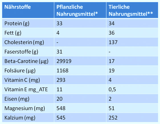 Fast exakt der gleiche Gehalt an Protein in Pflanzenkost und Tierkost! Zudem zeigen die Studien, dass tierliches Protein gesundheitsschädlich und pflanzliches Protein gesundheitsförderlich ist!