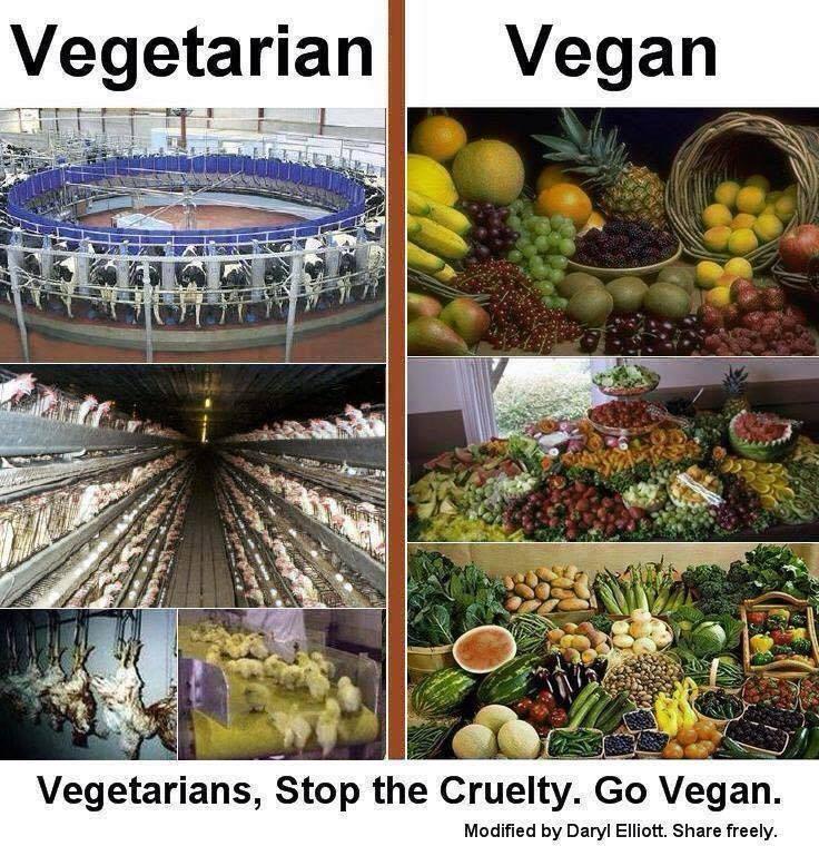 Der Unterschied zwischen Vegetarismus und Veganismus besteht darin, dass auf der einen Seite den Tieren schlimmstmögliche Gewalt (inklusive Ausbeutung, Vergewaltigung und Mord) angetan wird und auf der anderen Seite den Tieren grösstmögliche Achtung und Respekt entgegengebracht wird. Warum beide Lebensformen oft zusammen in eine Gruppe („Veggie“) gesteckt werden, muss bei genauerer Betrachtung als völlig unsinnig bezeichnet werden, da Vegetarier gegenüber Tieren mindestens so grausam und gewalttätig agieren wie Fleischesser bzw. Omnivore. Wahrscheinlich umschmeicheln die einschlägigen Organisationen die grosse Gruppe der Vegetarier (z.B. mit „Vegetarier sind auf dem richtigen Weg“) deshalb, damit diese als Spender Geld in die Kassen bringen. In Anlehnung an Bertolt Brecht könnte man hier formulieren: „Erst kommen die Spendengelder und dann die Moral“. Denn es ist widerlich, den Vegetariern zu suggerieren, mit ihrer grausamen Gewalt gegen Tiere seien sie „auf dem richtigen Weg“.
