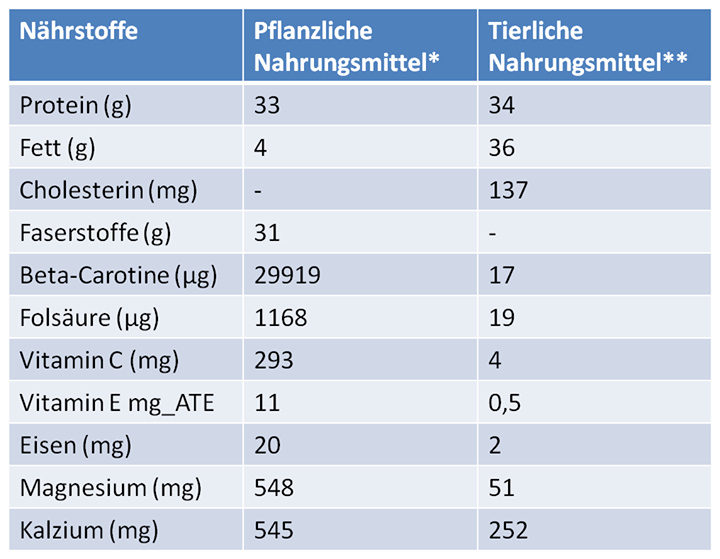 Verglichen wurden der Nährstoffgehalt von 500 kcal pflanzlicher Nahrungsmittel (gleiche Anteile von Tomaten, Spinat, Bohnen, Erbsen und Kartoffeln) mit dem Nährstoffgehalt von 500 kcal tierlicher Nahrungsmittel (gleiche Anteile von Rind-, Schwein- und Hühnerfleisch sowie Vollmilch). Die Fakten entlarven die Ernährungsbetrüger sofort. Denn mit einer abwechslungsreichen, rein pflanzlichen Ernährung ist man bestens versorgt: