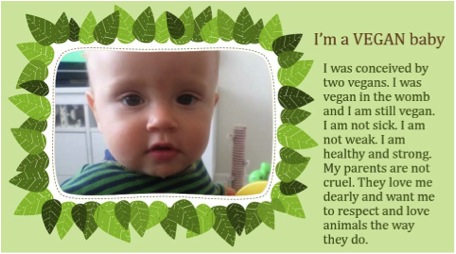 Ich wurde von zwei Veganern gezeugt. Ich war vegan im Mutterleib und ich bin immer noch vegan. Ich bin nicht krank, Ich bin nicht schwach. Ich bin gesund und stark. Meine Eltern sind nicht gefühllos. Sie lieben mich innig und wünschen sich, dass ich Tiere genau so respektiere und liebe wie sie selbst.