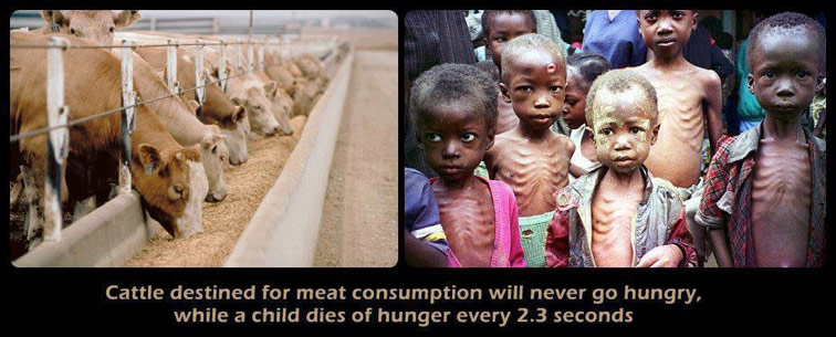 Täglich sterben zwischen 6.000 und 43.000 Kinder an Hunger, während ca. 40 % der weltweit gefangenen Fische, ca. 50 % der weltweiten Getreideernte und ca. 90 % der weltweiten Sojaernte an die „Nutztiere“ der Fleisch- und Milchindustrie verfüttert werden! 80 % der hungernden Kinder leben in Ländern, die einen Nahrungsüberschuss produzieren, doch die Kinder bleiben hungrig und verhungern, weil der Getreideüberschuss an Tiere verfüttert bzw. exportiert wird. Die Verfütterung von pflanzlicher Nahrung zur Erzeugung gesundheitlich bedenklicher tierlicher Produkte ist eine Absurdität, ein Skandal und eine Verschwendung der Superlative: Für die Erzeugung von nur 1 kg Fleisch sind je nach Tierart bis zu 16 kg pflanzlicher Nahrung und 10 – 20 Tonnen (10.000 – 20.000 Liter!) Wasser notwendig.
