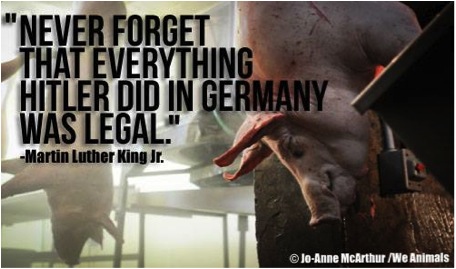 Das Schicksal der Tiere heutzutage ist ähnlich dem der Menschen, die Sklaverei und andere Menschrechtsverletzungen zu erleiden hatten. Denn die Tiere werden ebenso gefoltert, missbraucht und ausgebeutet wie einstmals oder wie auch heute noch Menschen. Alleine in den USA werden jedes Jahr mehr als 63 Milliarden (63.000.000.000) Tiere für die Nahrungsmittelindustrie geschlachtet, ohne dass man sich auch nur einen Gedanken um ihre Gefühle oder ihre Bedürfnisse macht. Sie verbringen ihr Leben in kleinen Ständen und Käfigen, von allem beraubt was natürlich und wichtig für sie ist, bis zum Tag ihrer Ermordung. Tiere leiden ebenso wegen ihres Missbrauchs in der Unterhaltung, der Mode und bei Tierversuchen.