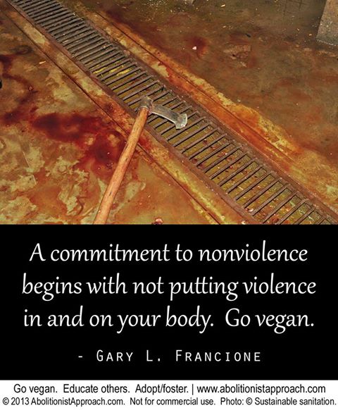 Dazu eine Erklärung von ProVegan Professor Francione trifft genau den Punkt: Es ist lächerlich und heuchlerisch gegen Gewalt zu sein, gleichzeitig aber die Gewalt durch den Konsum von Fleisch, Milch, Eiern und Fisch zu finanzieren und aufrecht zu erhalten. Und es sein betont, dass es dabei nicht nur um die schreckliche Gewalt gegen Tiere geht, sondern auch auch um die barbarische Gewalt gegen (ver)hungernde Kinder und Erwachsene, denen die Nahrung genommen wird, um damit die gequälten Tiere der Industrienationen zu mästen. Philip Wollen drückte es so aus: „Glauben Sie mir, jedes Stück Fleisch, das wir essen, ist ein Schlag in das verweinte Gesicht eines hungrigen Kindes!“