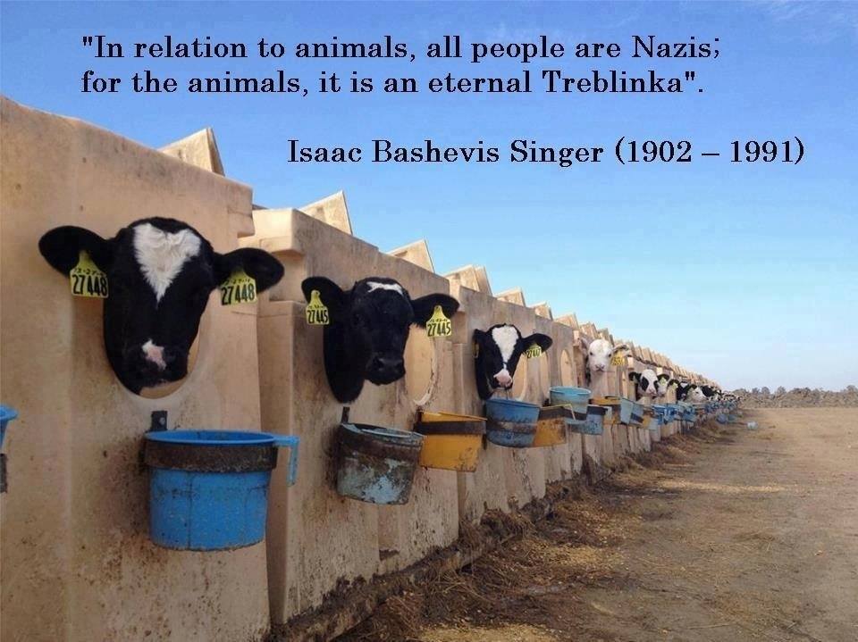 „Was wissen sie schon, all diese Gelehrten, diese Philosophen, die Führer der Welt, über dich und deinesgleichen? Sie haben sich eingeredet, der Mensch, der schlimmste Übeltäter unter allen Lebewesen, sei die Krone der Schöpfung. Alle anderen Kreaturen seien nur erschaffen worden, um ihm Nahrung und Pelze zu liefern, um gequält und ausgerottet zu werden. Ihnen gegenüber sind alle Menschen Nazis; für die Tiere ist jeden Tag Treblinka.“